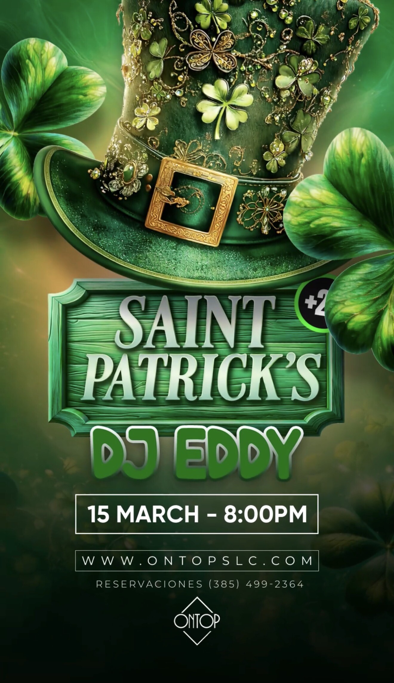 Saint Patrick's celebration arrives at ONTOP with a night full of music, energy and unforgettable vibes. Join us on March 15 as DJ Eddy takes over the night with the best Latin hits, reggaeton and party anthems to keep the dance floor alive all night long. Wear green, bring your crew and experience one of the most exciting nightlife celebrations in Salt Lake City.